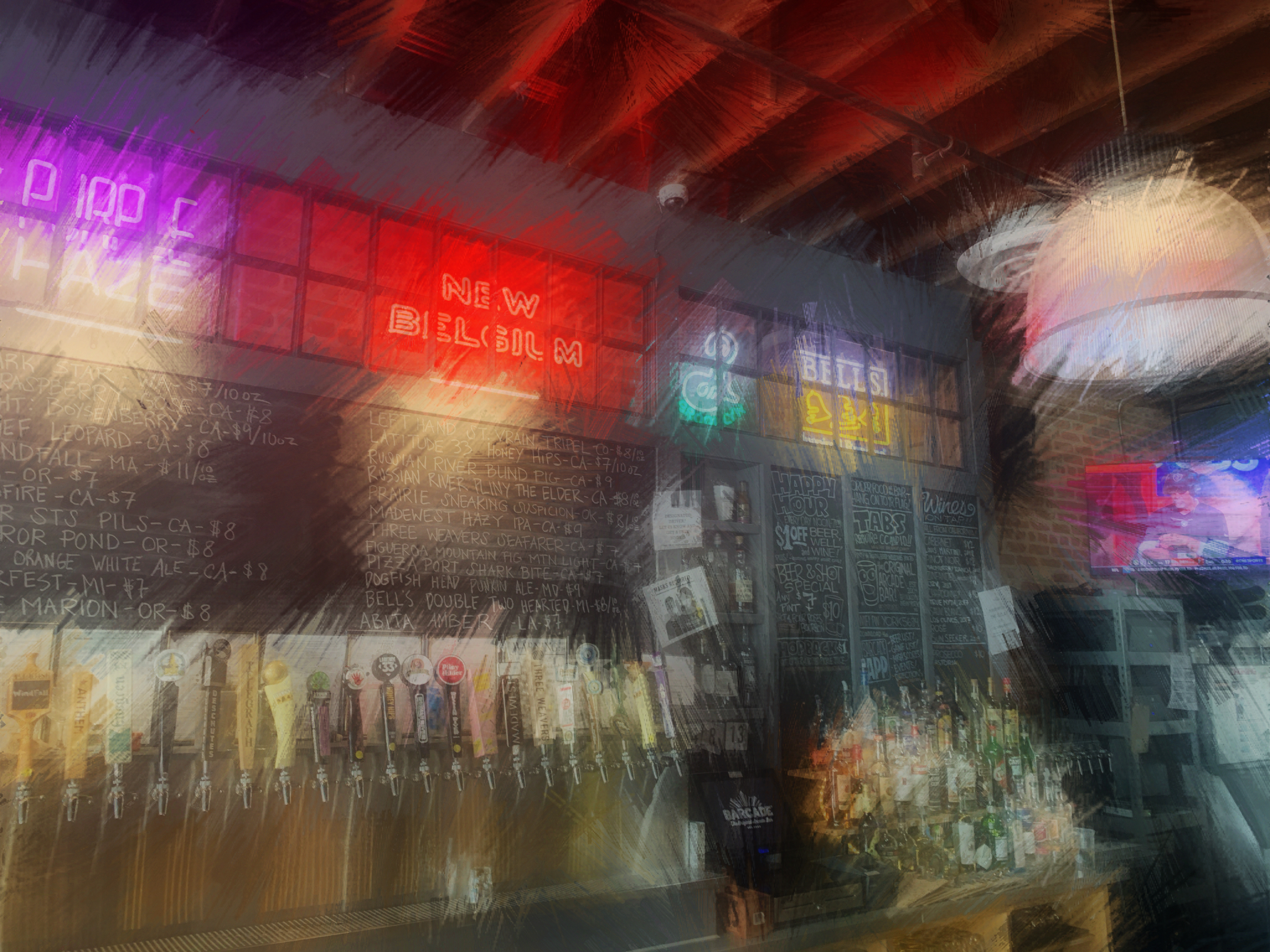 The shroud had morphed everything into a sunny parking lot of a bar along a fairly busy and pre-hip street. Dumpsters, stacks of kegs behind chain link, exterior conduit and mechanical piping, and a giant glass window that says in yellow LED neon, “BARCADE”