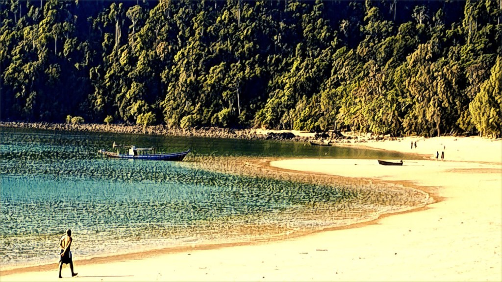 I hung my helmet from the handlebars and left the bike in what was either a parking lot or somebody’s cucumber garden. The problem with an empty island is the vague feeling of perpetual trespassing. I made my way past a handful of crescent beaked hornbills flash dancing in the trees above the restaurant, and kicked off my sandals to prepare for the beach. The horizon had wrapped the bay in its fiercest pre-dusk robes and sure enough, there bobbing before me I spotted an immense……….. single, solitary dingy.