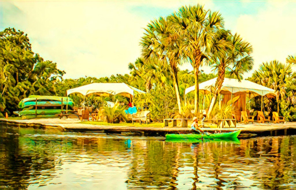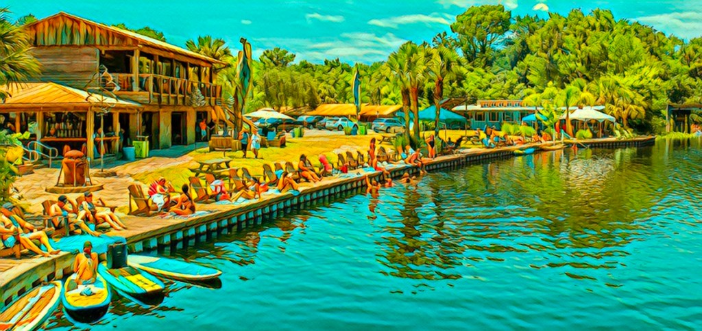 A leisurely float downstream, across the park boundaries, beyond the jurisdiction of park rangers, is Wekiva Island. If the state park is Eden, Wekiva Island is man’s fall from grace. It’s a riverside dive with all the features of the park plus the devil’s favorite temptations: blistered-hotdogs and iced-cold beer, pork-rinds and moonshine, horseshoes and g-strings, pit-bulls and Redbull, popsicle carts and volleyball courts, sandlot parking for pickups & dirt-bikes, and every color & creed of steroidal gimp and rednecked asshole and honkey-tonk woman Noah could gather before the flood. This is Florida.