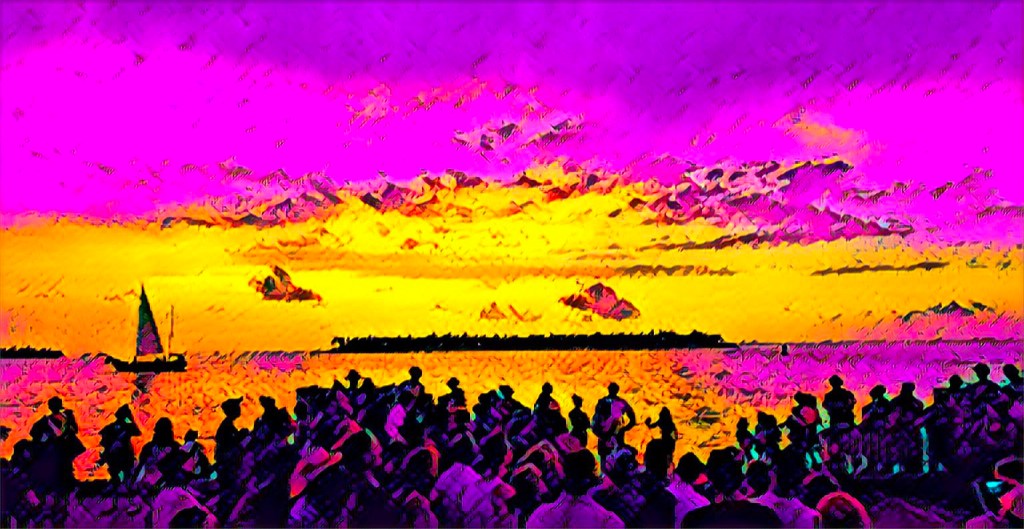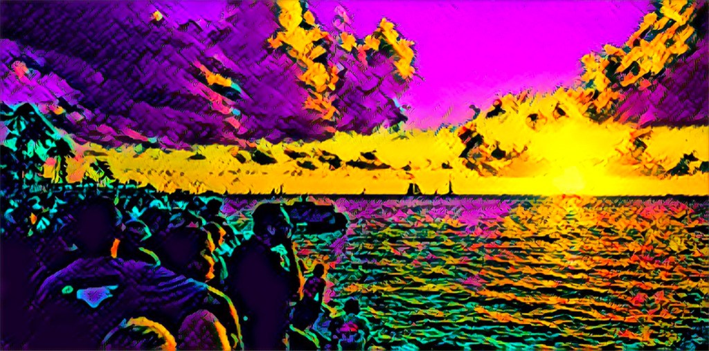Our beach-cruisers pass Mallory Square amidst applause and chants of “U-S-A! U-S-A!” as the sun dips into the Gulf of Mexico with the slightest green flash. Sam Gutter, resembling a circus bear atop an undersized bicycle, stops to admire the crowded square with a cigarette in one hand and his plastic cup of rum-drink in the other. He smiles like an eel. Victor, he says to me, you may want to get your tonsils checked… something’s going down tonight!