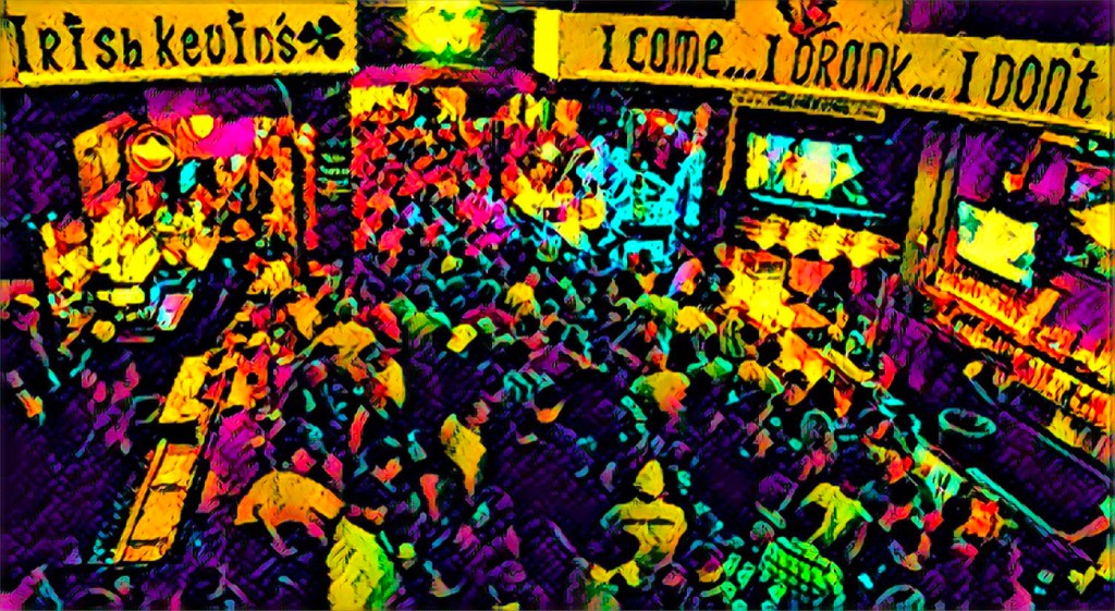 Irish Kevin’s is a seedy den of anti-imperialist rebels from bandit country, anti-depressant cruise-shippers from flyover country, antebellum hillbillies from red-state country and a shirtless DJ pelvic-thrusting as he plays the catchiest jingles from the last years of the last century. This is where Sam Gutter and I, on a prior night, met Michelle and her wildcat sisters and it is therefore where we begin our search. The crowd is thick, like a bucket of congealed concrete made by stirring together Tennessee whiskey with Florida dirtbag. Every face is the familiar drunk tourist: jet-ski fuckboi, siren-gazed trollop, resident ratfucker, overconfident rube, gold-dug trophy wife, Cuban cabana-boy, cougar step-MILF, jackasses from Ft Myers and then the real pervs. Few resemble Lake Eirie girls. Gutter sniffs out Salvatore’s aftershave and follows the scent to the bar where we find Sal spinning sketchy calculus with an earthy-chick wearing eagle-feather earrings and a tan suggesting she’s familiar to these climes. Her glossy-lips smile as Sal says, I am but an insignificant blip in the cosmos. We all are, he continues. And the universe is expanding, so we become even more insignificant with each passing moment, so there will never again be a moment as significant as this one. Mm-hmm, Eagle-Feathers hums to Sal, so what’s the catch, big-guy? Simple, Salvatore grins his disarmingly charming Irish-Italian smile, nothing matters more than you & me right here, right now. Sal tells her, don’t worry about your fiancé, he’s just some schlub from your past and the past is a vacuum of meaningless. Mm-hmm, Eagle-Feathers hums again, sure. Behind Salvatore, Sam Gutter creeps close enough to reach around and grab Sal’s nipple to twist as if turning a key in a car ignition. His breast suddenly mutilated, Sal curses as he wrestles the crab-claw from his chest. Fuck!, Sal says.