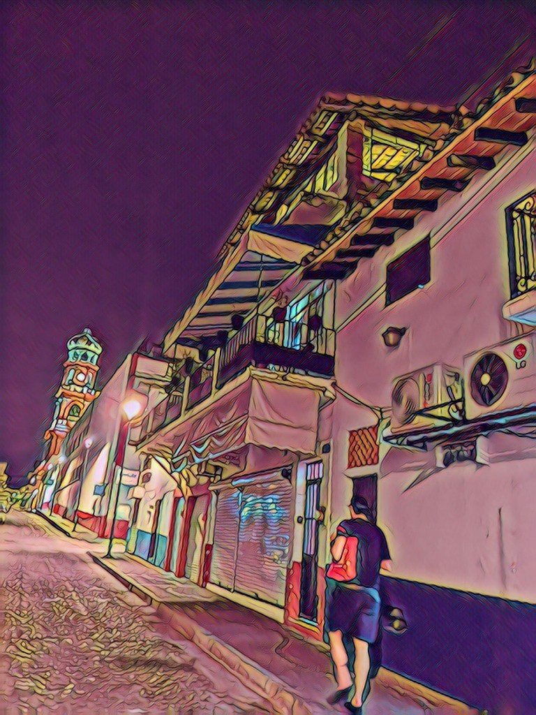 Six blocks and 179 steps below us is the scopious Malecon. The slow, sunny heartbeat of the city. On its mile-long boardwalk there are stalls with traditional talvera pottery and huiichol works of art as well as tequila hawkers flipping Nicaraguan cigars and bottles of baston del rey under the watchful eye of street artists busking in the flattened heat. All species of heron divebomb onto the glistening bay as little black squirrels chase each other up tiled trees and shutter-flash stucco.