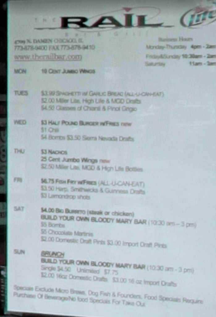 LOCATION: The Rail, a bar in Ravenswood, Chicago, Earth, near the Damen Station of CTA’s Brown Line. 41.97° N, 87.68° W. The Rail is a popular happy-hour dive for Northsiders returning home from their daily commute as well as a favorite brunch location frequented by suburban Chads & Trixies. Most popular on the menu is the Rail’s Sunday DIY bloody mary bar: for $7.50, you can receive unlimited bloody marys from 10:30 am – 3 pm.