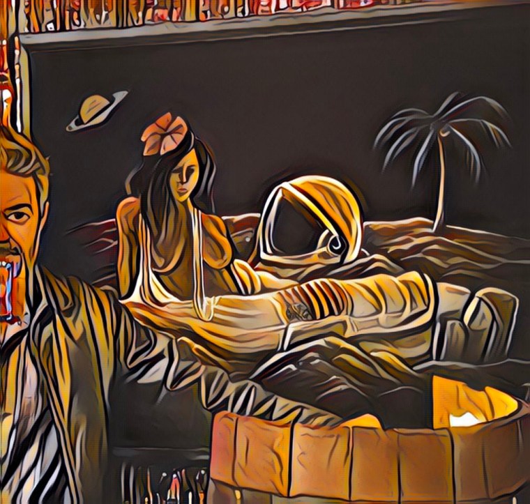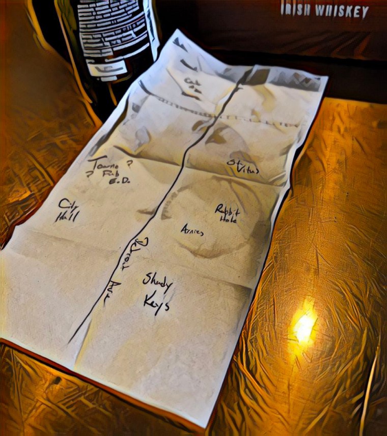 The quest was born. A quest to prove whether or not there are rogue bartenders roaming the Tulsa cityscape flipping quarters with their nipples. It wasn’t as easy as showing up at Towne Pub as we couldn’t find any record of this bar. I began drawing a map on a cocktail napkin. Next to “Towne Pub”, I wrote “E.D.”, cartographer speak for “existence doubted”. Our bartender at Mexicali had never heard of Towne Pub and told us to check with Jersey Jim at the Saturn Room. We left Mexicali, Bruno with a half-filled glass of cocktail hidden within his catcher’s pit of a hand and we walked the few blocks to the tiki bar known as Saturn Room.