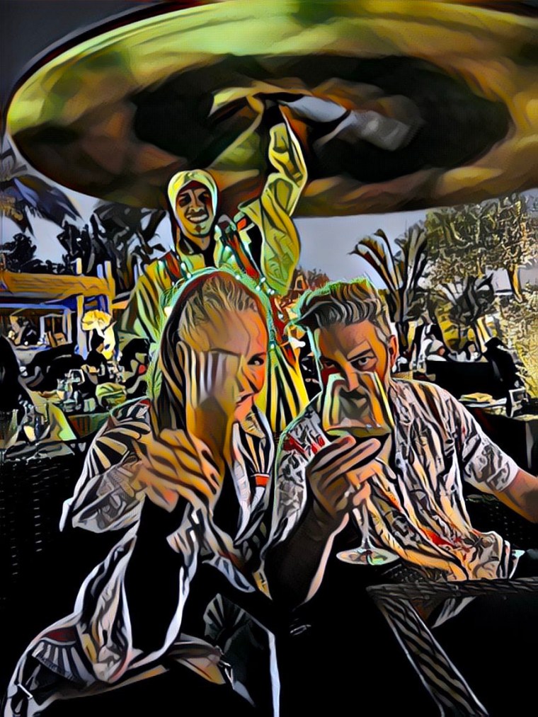 Vic opens a door to the pool deck and heads in the direction of music. A makeshift stage is facing the pool bar where dozens of tables are gathered to watch a performance of musicians and dancers. There is an oboe and other stringed instruments playing with the percussion of the dancers who are equipped with massive sticks. Tahtib, Vic says, it is an Egyptian martial art. Over here!, Vic says and guides the way to a table where hotel guests are seated. A dancer has approached the table and given his stick to Francis Wilbury who is expertly swinging the long pole over his head. Vic laughs, you can tell Frank is a couple martinis deep! Look at that coordination. Vic avoids the swing of the stick as he carefully pulls out two chairs at the table. Beside Francis is a woman covering her face in shame at Francis’ continued baton twirling. Vic introduces her as Deidre, a Canadian consulate attache. She flinches until Francis hands back the pole to the dancer.