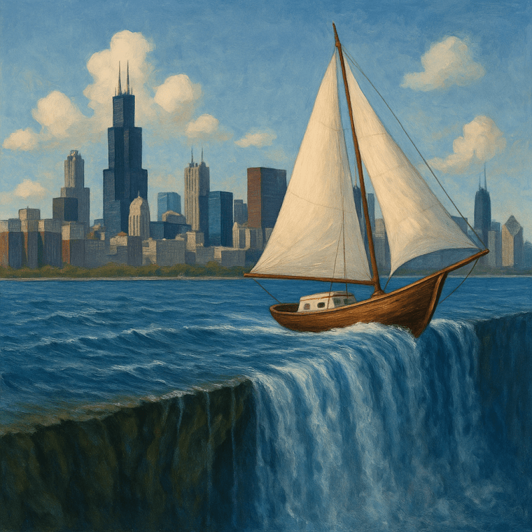 The sailboat, Tip of the Sandberg, is currently headed northeast on a southwesterly wind, attacking the massive lake waves directly. With each wave the bow of the sailboat rises before falling into the deep troughs between crests. This pitching motion leaves my stern position rising & falling like a see-saw. I am gripping onto the steel cable with my left-hand, knuckles white with pressure. My right hand is responsible for fidgeting with the fly of my chinos. Behind me… immediately behind me, their seat-backs near the stern, their blonde pony-tails brushing against the back of my calves, are Harvey’s wife & daughter drinking mimosas as Harvey waxes philosophical about golf course etiquette, which he calls “fairway morality”. I could lean back and sit on Mrs. Harvey’s head, she’s so close to where I stand.