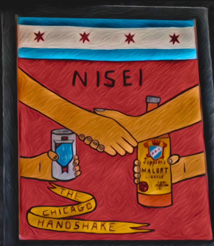 This cure was a Chicago Handshake: a drink combo comprising a beer & a shot. Technically, the pairing qualifies as a “boiler-maker” (1 shot, 1 beer), but not a “depth-charge” (1 shot dropped into 1 beer). The beer is Old Style, an ancient Chicago-brewed pilsner which tastes like a sweaty rag was left in the refrigerator overnight before being squeezed-out into rusty tin. It’s partnered with a shot of Malört, a Swedish liquor beloved by the most-unhinged Chicagoans for its bitterness and the resulting “Malört-face” seen in new initiates freshly arrived on the Chicago bar scene. Malört’s brand marketing leans-in with the diabolical legends of this pungent elixir: “These pants aren’t going to shit themselves”, one ad reads; “Tonight’s the night you fight your demons”, reads another.