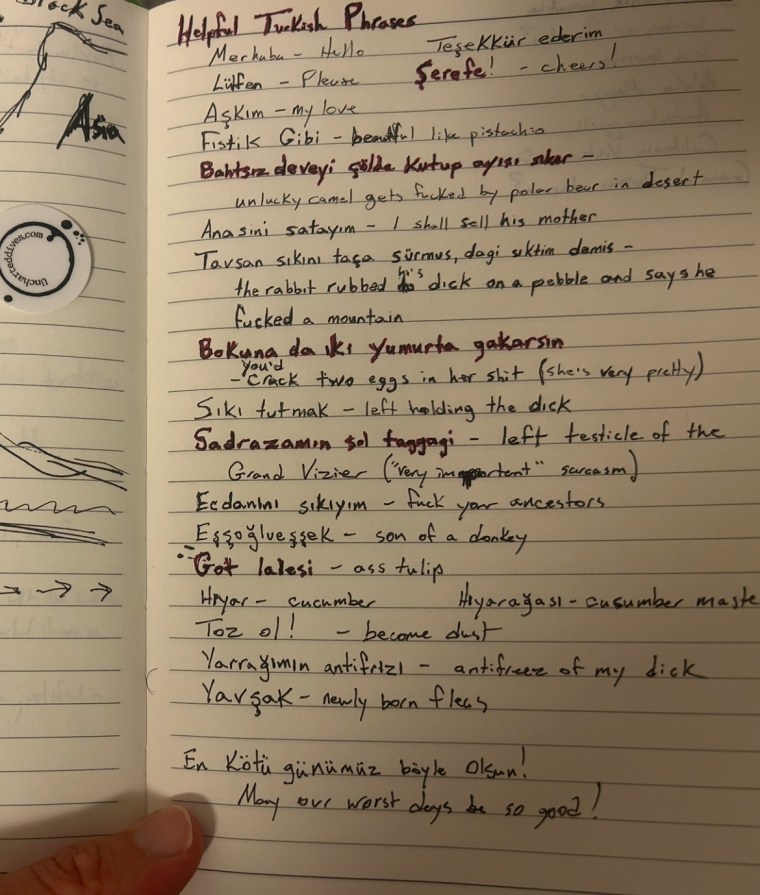 Before my descent into chaos, I consulted my journal. I had a list of helpful words & phrases which may be the difference between surviving the night or drifting down the Dardanelles with the morning tide. Blending-in with the crowd would be key. Even if this rebellion had pro-Western sentiments, it would be unwise for me to be easily identifiable as a westerner. On this night, I would become Turk.