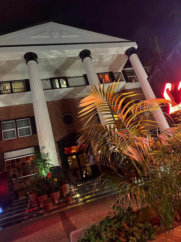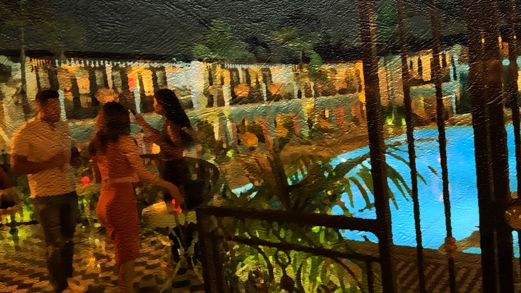 Upon my visit to the back courtyard, I observe a face stamped with impatience emerge from behind a lowered professional looking camera. Am I among celebrity? Fancy people are mingling by the ornate wrought iron railing just a few steps away. It is a great vantage point from where he is to them, with the darkened pool below and the hotel rooms with black and white striped canopies gently fluttering in the breeze. But, he is locking eyes with me…presumably waiting for me to pass through the shot. My camera (included conveniently within my phone) snaps a few hurried shots of my own before I oblige, thinking a drink will surely elevate this atmosphere. His picturesque, laughing subjects don’t ever look around to log the intrusion.