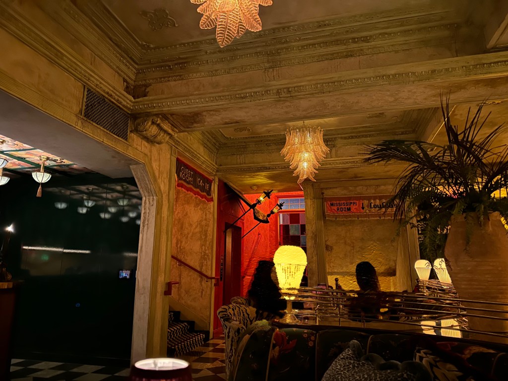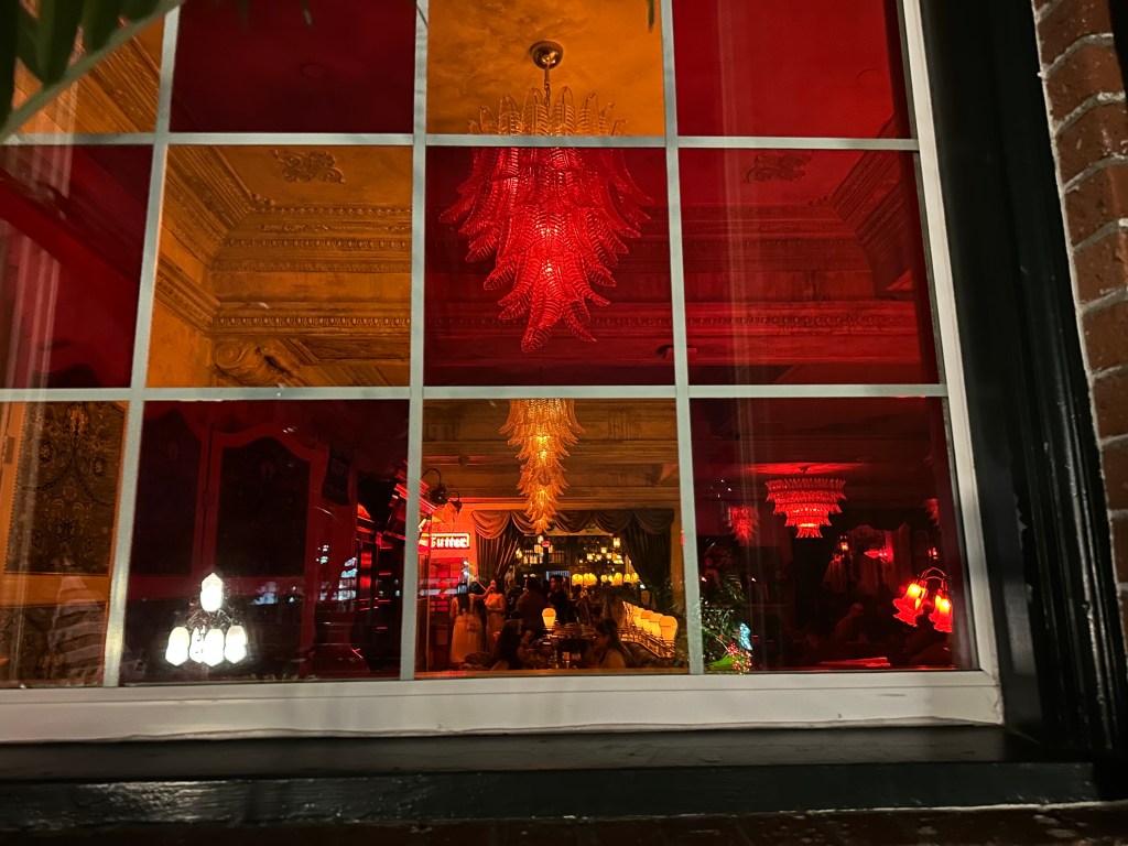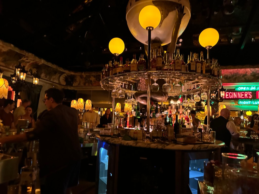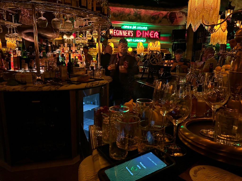 Traversing the black and white checkered floors, I spot my table, my intended destination. Like warp tunnels to different worlds, I can spy corridors leading to other hidden locations, down stairways or through double doors. What is the Mississippi room? What is the Lou Lou’s? the Quixote? Our round table is near the front entrance in front of a fully staffed coffee bar. “Anybody hungry?” I want to know as I set down the drinks. There is a diner under neon lights adjacent the main room. The oohs and ahhs at the fancy drinks are the only answer I receive. The suggestion was more rhetorical anyway, finding this open table was a challenge I’m not eager to repeat. Truly, the drink is all we desire, and they do deliver.